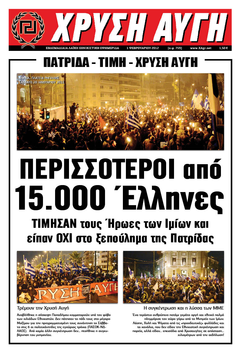 Η ΧΡΥΣΗ ΑΥΓΗ ΚΙΛΚΙΣ για δεύτερη χρονιά συμμετείχε στην μεγαλειώδη πορεία για την μνήμη των 3 Ηρώων των Ιμίων που έδωσαν την ζωή τους για την πατρίδα και πέρασαν στην αιωνιότητα μαζί με τα εκατομμύρια των Ηρώων που γεμίζουν με χρυσά γράμματα τις σελίδες της Ελληνικής ιστορίας. 15.000 και πλέον Έλληνες Εθνικιστές έδωσαν το παρών στο ποτάμι που πλημμύρισε το κέντρο της Αθήνας και για λίγες ώρες έδωσαν μια εικόνα που έχει λείψει από τους κατοίκους του κέντρου εδώ και χρόνια. Ένα κέντρο καθαρό απο μετανάστες που βρομίζουν με την παρουσία τους και την εγκληματική τους συμπεριφορά μια πόλη σύμβολο για την Ευρώπη και το κόσμο ολόκληρο και την έχουν μετατρέψει σε μια χαβούζα ανθρώπων και πολιτισμών για χάρη των λίγων που πλουτίζουν νοικιάζοντας τα διαμερίσματα τους με το κεφάλι και επιχειρηματιών που είτε προωθούν τα μαϊμού προϊόντα τους είτε χρησιμοποιούν την νέα τάξη σκλάβων στις επιχειρήσεις τους με αμοιβές που είναι εξευτελιστικές άλλα και φεύγουν σε μορφή συναλλάγματος στο 100% σχεδόν στο εξωτερικό. Το κακό είναι ακόμα μεγαλύτερο αν αναλογιστεί κανείς ότι τα χαμηλά μεροκάματα των μεταναστών ισοπεδώνουν ωσμωτικά το σύνολο των μεροκάματων δημιουργώντας έτσι προηγούμενο και δημιουργώντας έναν φαύλο κύκλο στην εργασία, με Έλληνες που δεν μπορούν να τα βγάλουν πέρα με τέτοια μεροκάματα και παραχωρώντας τις θέσεις τους αναγκαστικά σε μετανάστες οι οποίοι ζουν παρασιτικά από συσσίτια που πλέον αδυνατούν να καλύψουν έστω και στοιχειωδώς τις ανάγκες των Ελλήνων νεοαστέγων. Δεν θα αναφερθώ στην πάσης φύσης εγκληματικότητα που από πρώτο θέμα στις εφημερίδες 10 χρόνια πριν, πλέον είναι τόσο μαζικά και καθημερινά που ούτε καν λόγος γίνετε στον ημερήσιο τύπο και γενικότερα στα μέσα μαζικής ενημέρωσης.