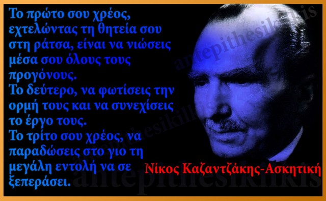 Η πίστη στην ράτσα στην φυλή μας και στο Έθνος κατά τον Καζαντζάκη είναι το μεγάλο μας χρέος, να συναισθανθούμε τα χιλιάδες χρόνια ιστορίας μας, να ενισχύσουμε τον χείμαρρο που πηγάζει στην γέννεση του ανθρωπίνου πολιτισμού και θα καταλήξει εκεί που θα πάψει να υπάρχει.