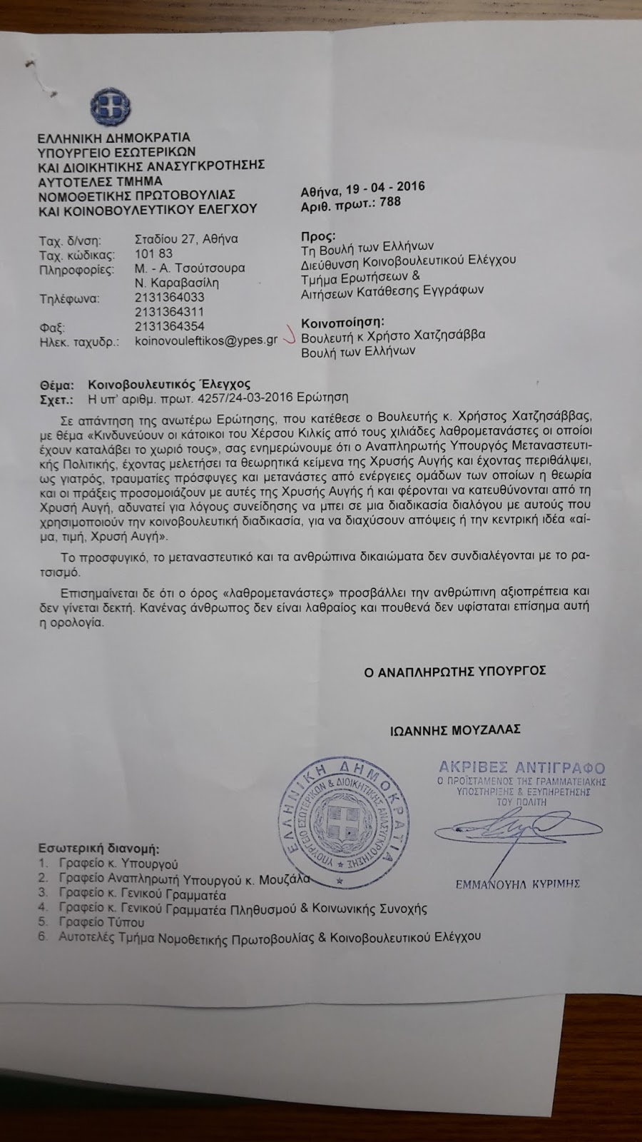 Αυτή είναι η απάντηση του Μουζάλα στον εκλεγμενο δημοκρατικά βουλευτή Κιλκις του Λαϊκού Συνδέσμου Χρυσή Αυγή Χατζησαββα Χρήστου.