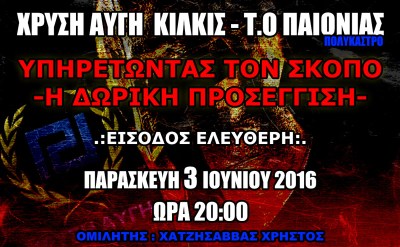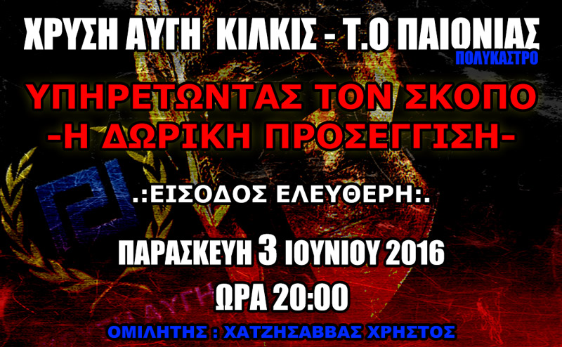 Την Παρασκευή 3 Ιουνίου 2016 και ώρα 7 θα λειτουργήσουν τα γραφεία με αφορμή τα Τρία(3) χρόνια λειτουργίας της στεγασμένης τοπικής οργάνωσης του Λαϊκού Συνδέσμου Χρυσή Αυγή. Στις 20:00 θα πραγματοποιηθεί ομιλία του βουλευτή του Κινήματος μας Χρίστου Χατζησάββα με θέμα ”πως υπηρετούμε τον Σκοπό μας απο την προσέγγιση του Δωρικού τρόπου σκέψης.”