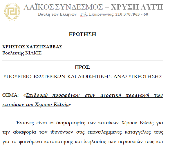 Ερώτηση κατέθεσε ο βουλευτής της ΧΡΥΣΗΣ ΑΥΓΗΣ στο Κιλκίς Χατζησάββας Χρήστος σχετικά με τις καταστροφές σε καλλιέργειες στο Χέρσο του Κιλκίς απο λαθρομετάνάστες.