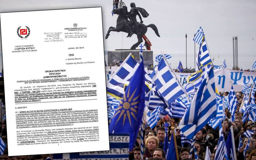 Ο Λαϊκός Σύνδεσμος – Χρυσή Αυγή κατέθεσε στην Βουλή και απέστειλε στις Κοινοβουλευτικές Ομάδες και όλους τους Βουλευτές πρόταση για την διεξαγωγή δημοψηφίσματος, ώστε να αποφασίσει ο Ελληνικός Λαός, αν αποδέχεται ή ΟΧΙ την συμφωνία των Πρεσπών.